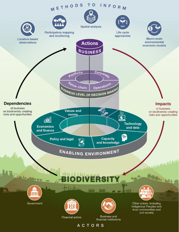 Les activités économiques et modes de vie sont à l’origine de nombreuses crises environnementales, mais les entreprises peuvent participer au changement en portant des solutions, grâce à un plan d’action éclairé, fondé sur des connaissances spécifiques et scientifiques, dépendantes du contexte et du secteur, sur les impacts et leurs dépendances.